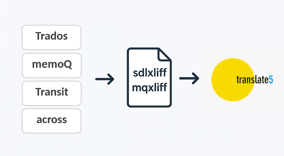 Import and processing of various CAT formats: SDLXLIFF, MQXLFF, Transit language pairs, Across XLIFF