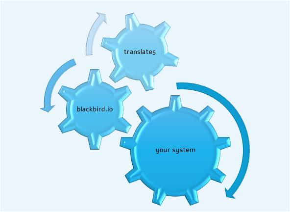 The platform blackbird.io enables automation and orchestration of multilingual content workflows. Connect your translate5 to the platform thanks to its own Blackbird app and utilize the comprehensive automation of projects, tasks, translations, and review processes. All functions can be controlled programmatically via REST API or Blackbird workflows, which guarantees maximum efficiency, scalability, and transparency. This allows you to retain full control, even of complex projects, at all times – with minimum manual effort and maximum flexibility.