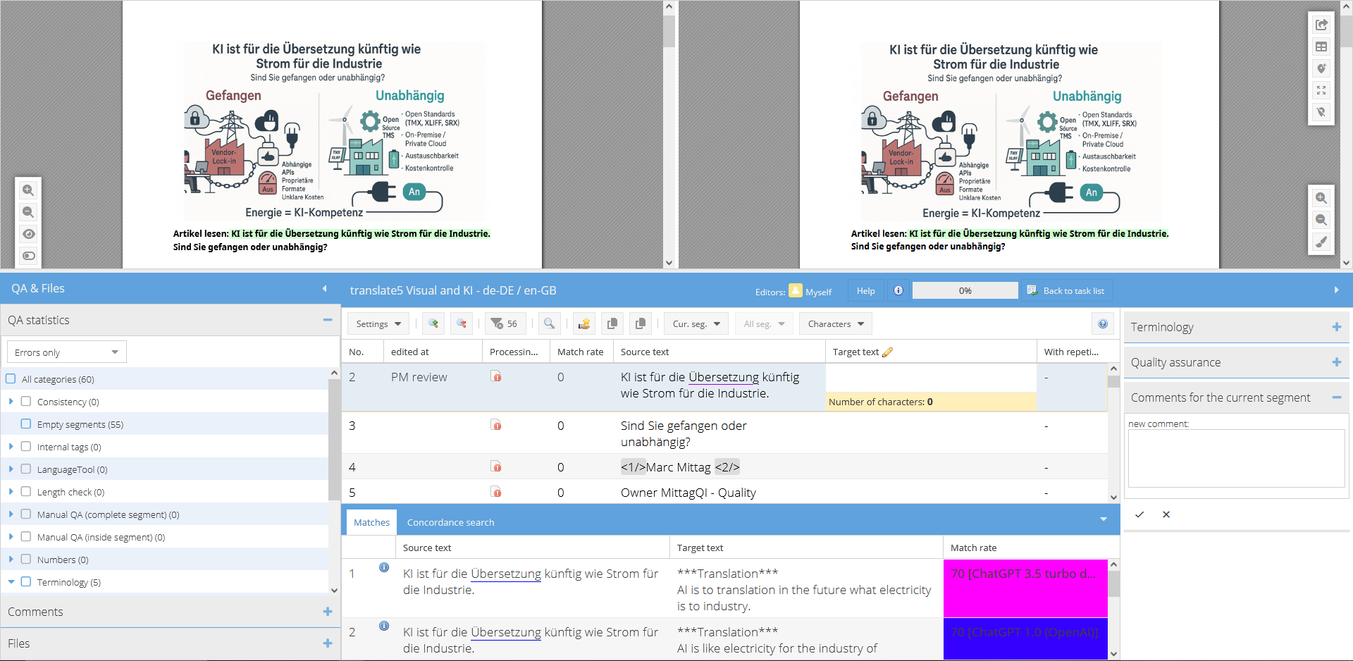 translate5 Visual is not limited to a specific CAT tool, but can be seamlessly integrated into existing translation or review processes. Regardless of whether you work with Trados, memoQ, Across or Transit – simply upload the relevant XLIFF files or the language pair together with a layouted PDF file. translate5 Visual automatically generates a clear, interactive review view.