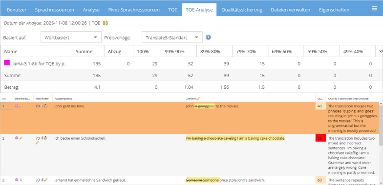 Sie möchten in möglichst kurzer Zeit herausfinden, welche der automatisch vorübersetzten Segmente den Hauptfokus beim Post-Editing benötigen? Dann analysieren Sie Ihre Übersetzung mit translate5 LQA. Diese basiert ebenfalls auf einem LLM, enthält aber eine Systemnachricht, die das Modell dazu instruiert, die übersetzten Segmente zu analysieren und mit einer Qualitätsrate zu versehen. Diese können Sie einsehen: