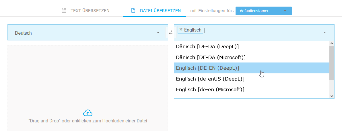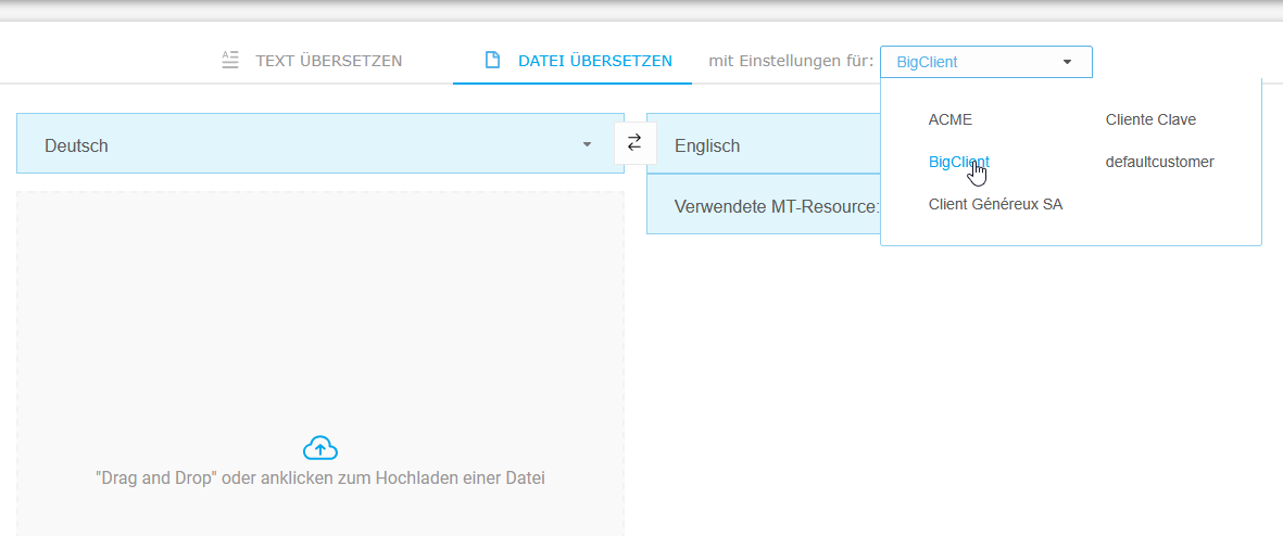 Wählen Sie die Kundeneinheit, mit deren Sprachressourcen Ihre Datei übersetzt werden soll – ganz nach Bedarf: